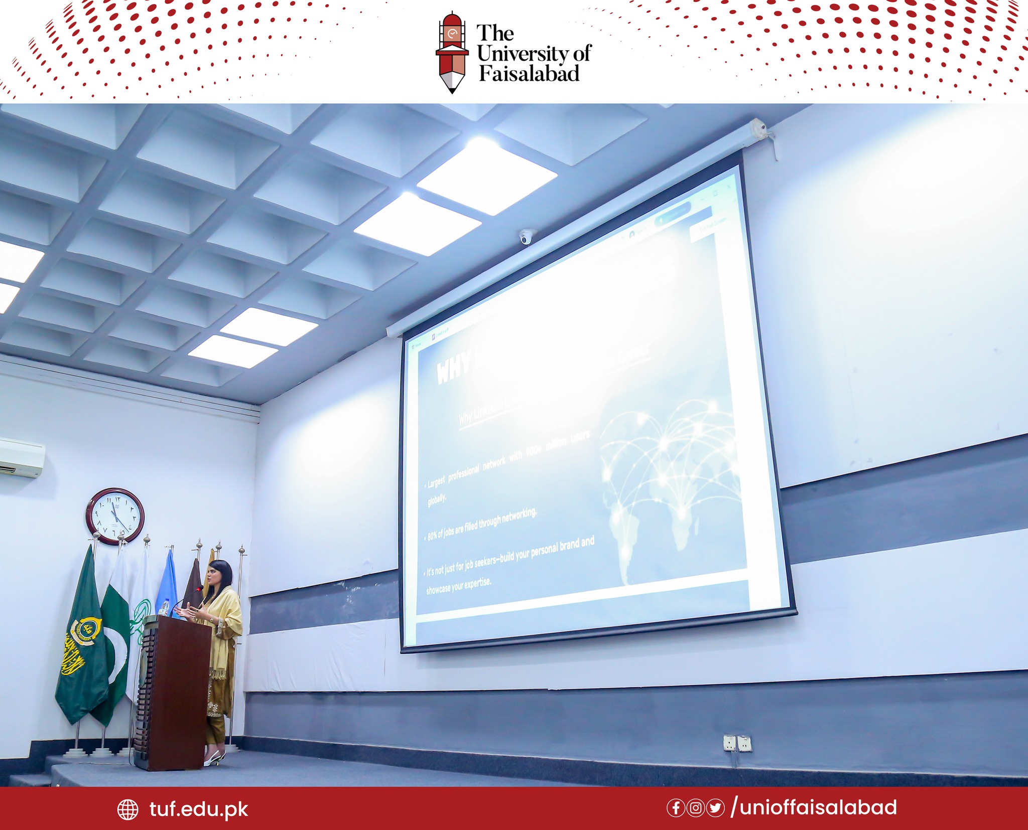 The University of Faisalabad, in collaboration with Placement Bureau, organized a distinguished seminar titled "Effective Use of LinkedIn for Networking and Job Searching", on 26 November 2024. The event featured Ms. Amaima Iftikhar Khan, CEO and Founder of Upmark and Khudmukhtar NGO, as the esteemed guest speaker. The session empowered students with practical strategies to enhance their professional profiles and build meaningful connections.Guest speaker shared expert tips on leveraging LinkedIn for career growth, leaving attendees inspired and prepared to navigate the competitive job market.